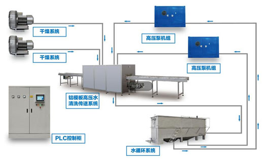 工人先由電控柜的觸摸屏開啟高壓泵組,并將壓力調至使用壓力。再由觸摸屏,操控傳送線啟動。當滾輪轉動后,由工人將待清洗的鋁模板放至傳送線上。在傳送線的傳送下,經過清洗區域,由清洗盤噴射出的高壓水進行清洗。再經過過渡區域的控水后,進入干燥區域由羅茨風機進行風干。清洗好的鋁模板傳送出干燥區域,由工人搬運至存放處。